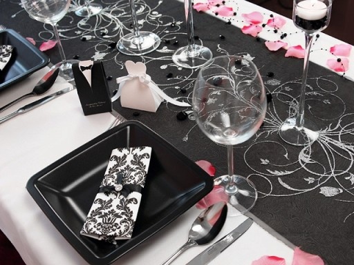 Черная органза с серебряным узором из тюля, украшение стола на Рождество.