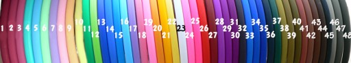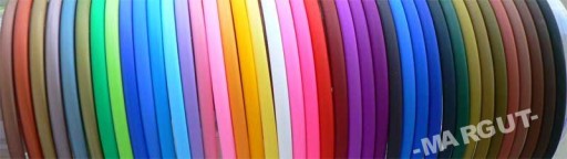 Kauczukowe, cienkie opaski, w 48 kolorach: matowe, w żywych i pastelowych odcieniach. Opaska z pojedynczym rzędem ząbków, z kauczuku. Szerokość opaski ok. 7 mm.