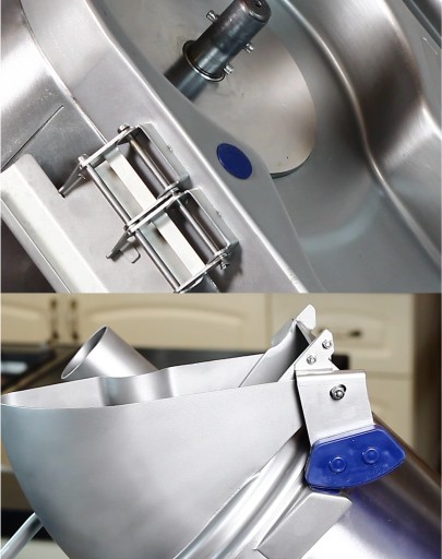 - Mikrowyłącznik magnetyczny dociskacza zatrzymujący silnik w przypadku uchylenia dociskacza w celu włożenia kolejnej porcji warzyw do otworu zasypowego. Po dociśnięciu popychacza silnik uruchomi się samoistnie.