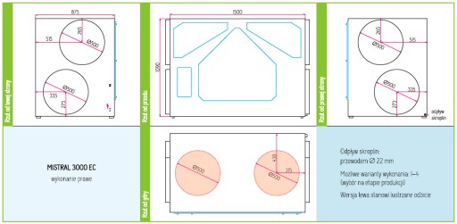 ** Uwaga: średnica króćców przyłączeniowych centrali wynosi 500 mm, do podłączenia wymagane jest zastosowanie dodatkowych redukcji.