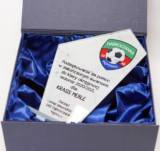 Niebieskie etui wyścielone błękitnym płótnem atłasowym jest eleganckim dodatkiem do statuetki.