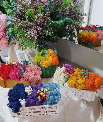 Kolorowy preparowany mech reniferowy ma zastosowanie w szeroko rozumianej florystyce, dekoratorstwie i architekturze.