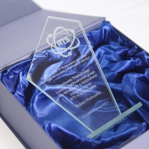 Niebieskie etui wyścielone błękitnym płótnem atłasowym jest eleganckim dodatkiem do statuetki.