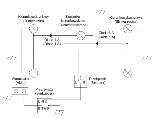 Schemat podłączenia przerywacza w przypadku kiedy nie ma kontrolki kierunkowskazów