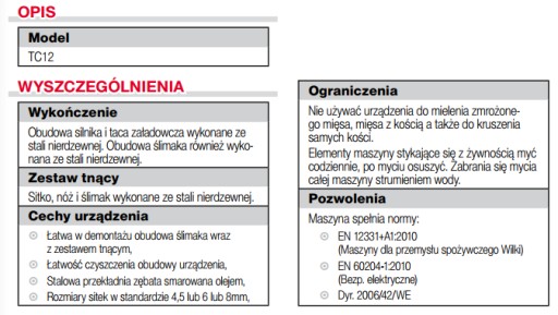 – możliwość zakupu wymiennego podzespołu gardzieli (gardziel + ślimak + nóż + sitko + nakrętka)