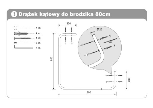 Zestaw zawiera: drążek aluminiowy w kolorze białym o średnicy 25mm (3 elementy do łączenia), kołki rozporowe fi 8mm (4szt.), zaślepki maskujące (4szt.), śruby dociskowe (2szt.), klucz imbusowy, instrukcję montażu.