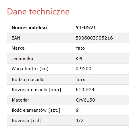 Komplet specjalistycznych nasadek torx, stosowanych w motoryzacji, mechanice oraz elektronice. Nasadki wykonane są ze stali chromowo-wanadowej CrV 6150, która gwarantuje ich wytrzymałość i długą żywotność. Zestaw zawiera nasadki współpracujące z grzechotkami YATO.