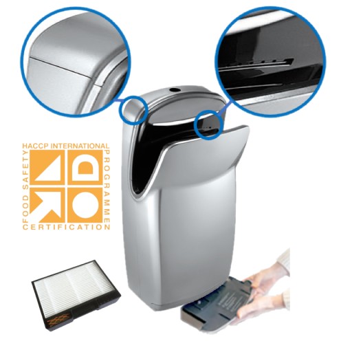 Opatentowany system filtrowania powietrza HEPA13 zatrzymuje i zabija 99.7% wszystkich bakterii, pyłków a nawet wirusów. Powietrze jest czyste by higienicznie suszyć dłonie. Możliwość stosowania specjalnej kostki zapachowej Zero Smell dodatkowo eliminuje nieprzyjemne zapachy w pomieszczeniu.