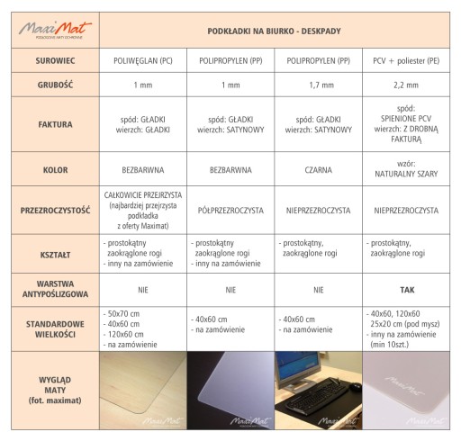 Poniżej porównanie wszystkich rodzajów podkładek na biurko/stół jakie mamy w ofercie: