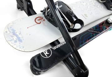 Zamontowany na bagażniku uchwyt z deską snowboardową