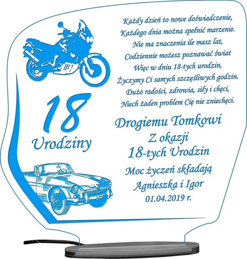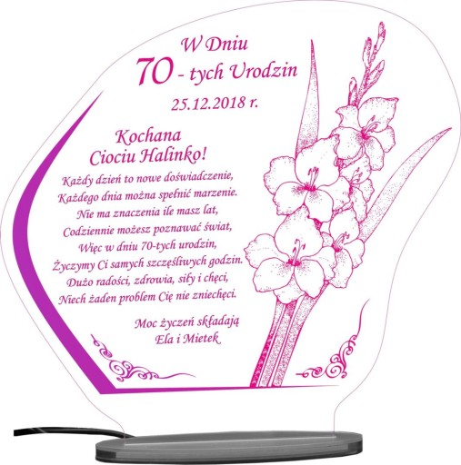 Do zaoferowania mamy unikalne podświetlane statuetki na urodziny, imieniny. Statuetki wykonane są z wysokiej jakości przezroczystego akrylu o grubości 5 mm, na którym znajduje się biały grawer. Po włączeniu podświetlenia grawer świeci na kolor przez Państwa wybrany. Statuetka zasilana jest zasilaczem wtyczkowym przymocowanym do statuetki na stałe.