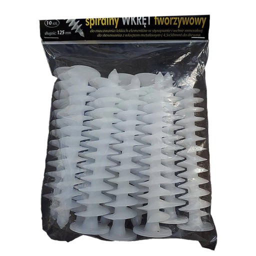 Spiralny wkręt tworzywowy, ślimak służy do mocowania elementów w styropianie i wełnie mineralnej. Stosować z wkrętem do drewna 5 x 40 mm.