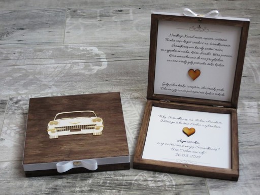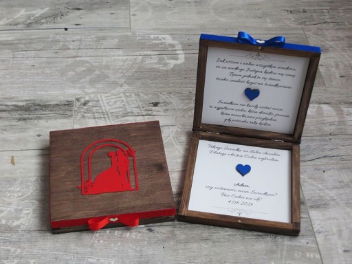 Sprzedajemy wykonywane na zamówienie zaproszenie dla świadka/świadkowej. Jest to drewniane pudełko pomalowane na kolor ciemnego drzewa(brąz) wykańczane ręcznie. Ozdobione dekorem (do wyboru) oraz zdobieniami (wstążka i serduszka w środku).