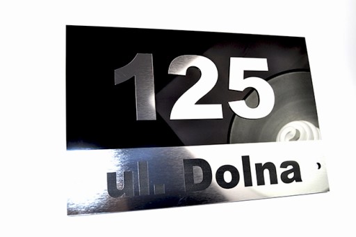 Na tej aukcji oferujemy tabliczkę na drzwi wykonaną z błyszczącej pleksi o grubości 3 mm oraz laminatu grawerskiego, o grubości 1,6 mm w kolorze srebro szczotkowane odpornym na warunki atmosferyczne, posiada filtr uv.