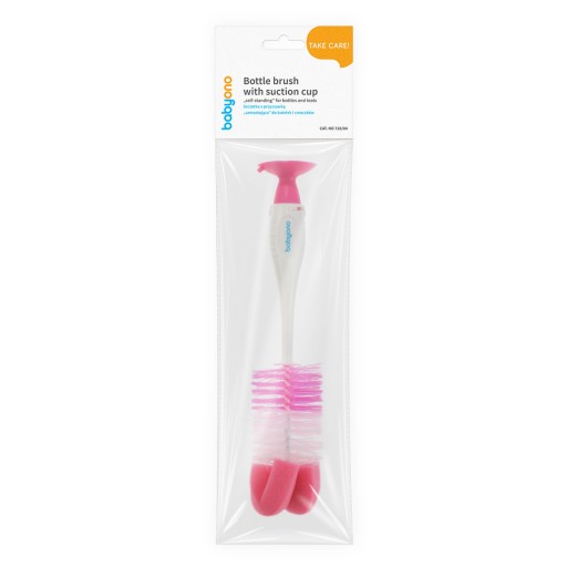 Szczotka z przyssawką „SAMOSTOJĄCA” pomaga w dokładnym czyszczeniu zarówno butelki, jak i smoczka. Szczotka posiada przyssawkę, która umożliwia przyczepienie jej do płaskich powierzchni, dla ułatwienia osychania. Szczotka do butelki jest zakończona miękką gąbką, która dostosowuje się do kształtu butelki. W uchwycie rączki jest schowana mała szczotka do czyszczenia smoczka. Miękkie włosie szczotek i gąbka docierają do trudno dostępnych miejsc. Szczotki wykonane są z trwałych i bezpiecznych materiałów, nie zawierających Bisfenolu A.