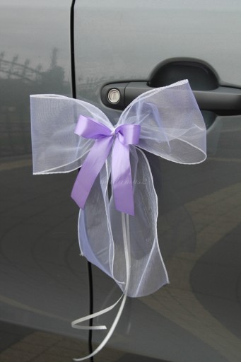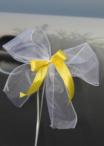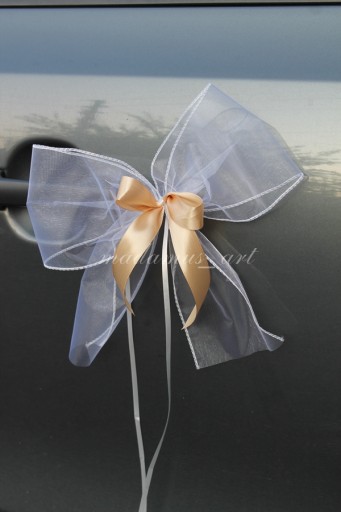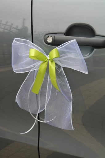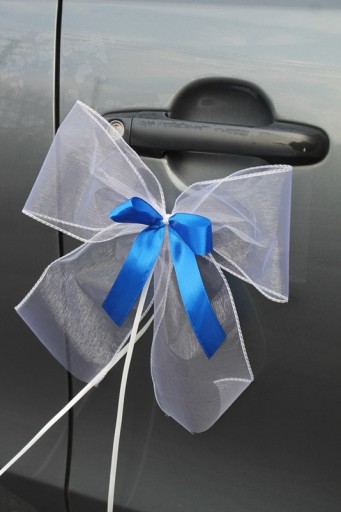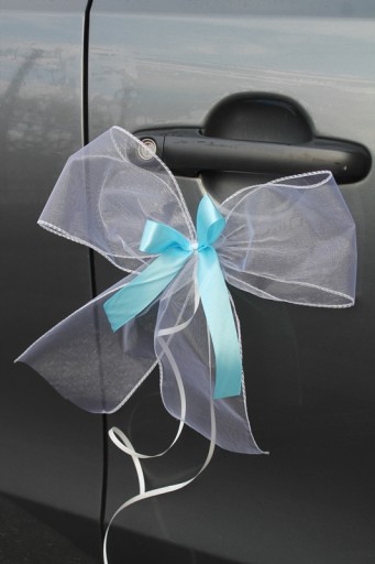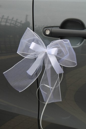 Kokardy zostały wykonane z białego szyfonu przyozdobionego satynową tasiemką w wybranym kolorze.
