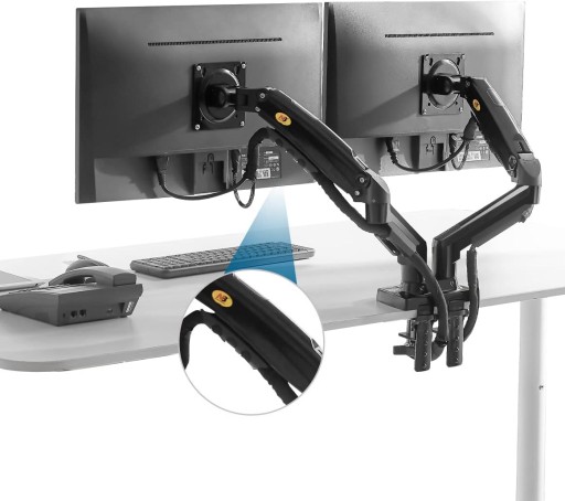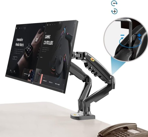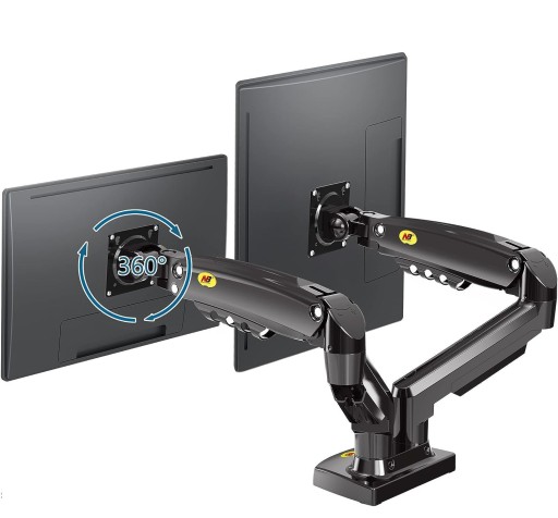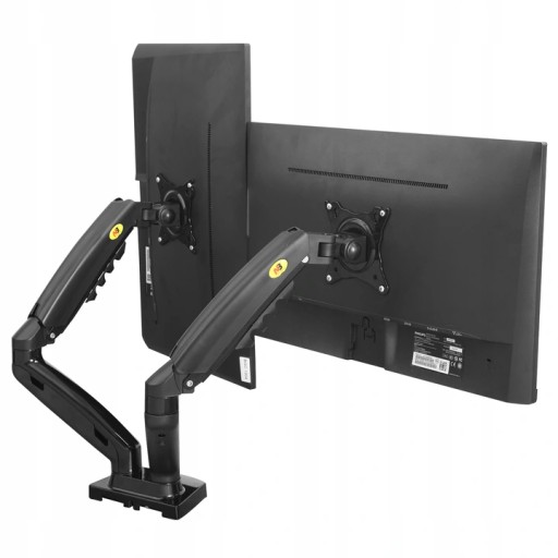 Obrotowy, biurkowy uchwyt do dwóch monitorów LCD LED z pełną regulacją 3D i płynną regulacją wysokości na sprężynie gazowej.