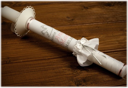 - Świeca z haftem w kolorze różowo-srebrnym, okapnik.