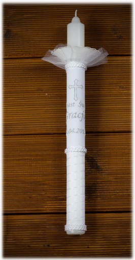 - Świeca z haftem w kolorze srebrnym, dekoracja biało srebrna, okapnik.