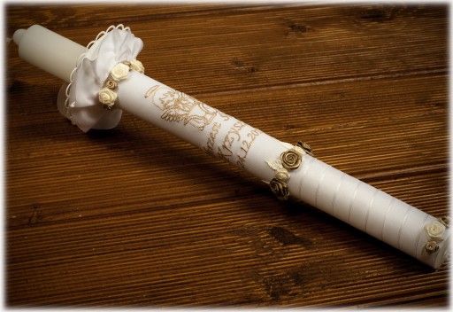 - Świeca z haftem w kolorze złotym, w zestawie jest plastikowy okapnik.