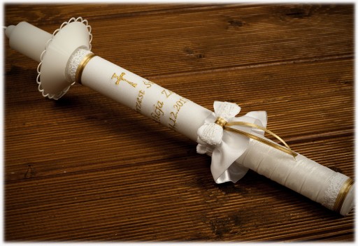 - Świeca z haftem w kolorze złotym, okapnikiem udekorowanym marszczoną muślinową wstążką.
