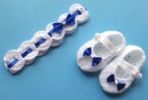 Komplet szydełkowy: opaska+buciki może być wykonany w dowolnym kolorze włóczki i dodatków - z kokardkami satynowymi (atłasowymi) lub szyfonowymi (tiulowymi).