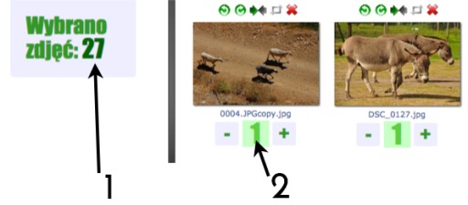 Każde zdjęcie możesz wydrukować jeden lub więcej razy. Pod zdjęciami plusem i minusem wybierasz ilość. W lewym górnym rogu podane jest ile zdjęć jest już wybranych.