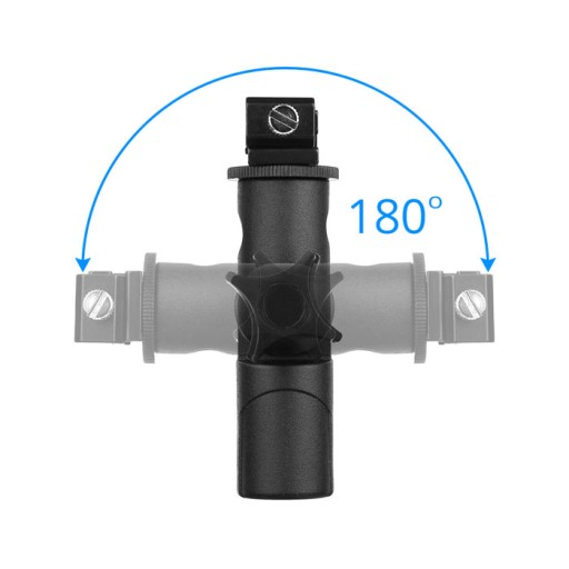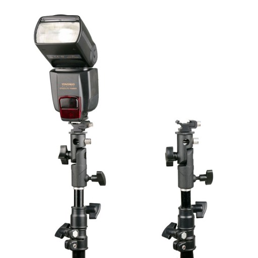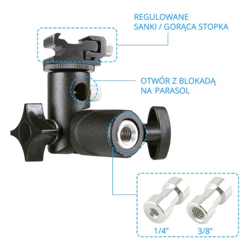 Uniwersalny uchwyt pozwalający na zamontowanie lampy błyskowej na statywach oświetleniowych z głowicą 16mm oraz na gwint 1/4 i 3/8 cala. Dzięki temu zewnętrzna lampa błyskowa unika błysku równoległego do osi optycznej obiektywu.