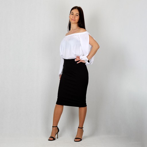 Spódnica wykonana jest z wysoko gatunkowej dzianiny o długości midi. Materiał nie mechaci się ani nie "kulkuje". W pasie wszyta guma podwinięta do środka.