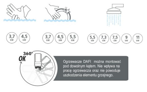 Dane techniczne podumywalkowego ogrzewacza wody Dafi z przyłączem: