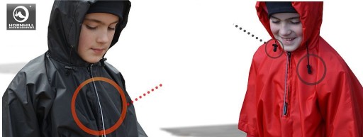 - W górnej części peleryny zapinane są na zamek. Z boku spinane są napami .