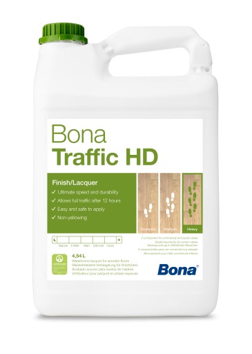Bona Traffic HD to 2-komponentowy wodny lakier nawierzchniowy do stosowania na podłogach drewnianych w miejscach użyteczności publicznej narażonych na wysokie ścieranie.