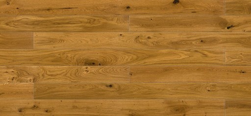 Jednopasmowa podłoga z dębu, pokryta lakierem matowym. Złotawy kolor odzwierciedla stare dębowe dechy. Dodatkowo krawędzie podłogi fazowane z czterech stron.