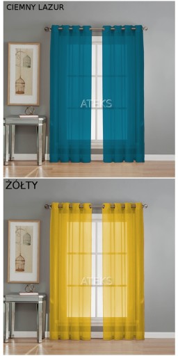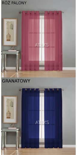Zasłona gotowa z woalu gładkiego wykonana na metalowych, srebrnych przelotkach. Zasłona dekoracyjna w górnej części ma wszytą taśmę usztywniającą w której są nabite przelotki. Zasłona dekoracyjna półprzezroczysta służąca najczęściej jako lekka, zwiewna, delikatna firana jako dopełnienie całości aranżacji okiennej.