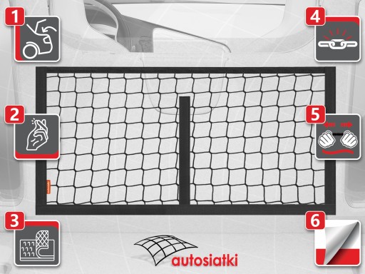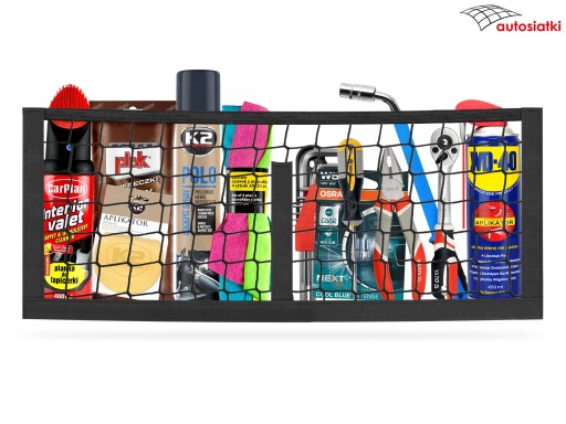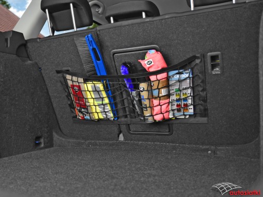 To wytrzymała siatka obszyta od dołu, po bokach i na środku taśmą typu rzep. Od góry wykończona gumą, która chroni akcesoria przed przemieszczaniem. Przegroda dzieląca siatkę umożliwia rozdzielenie akcesoriów. Kieszeń mocuje się do wykładziny w bagażniku lub kabinie auta.
