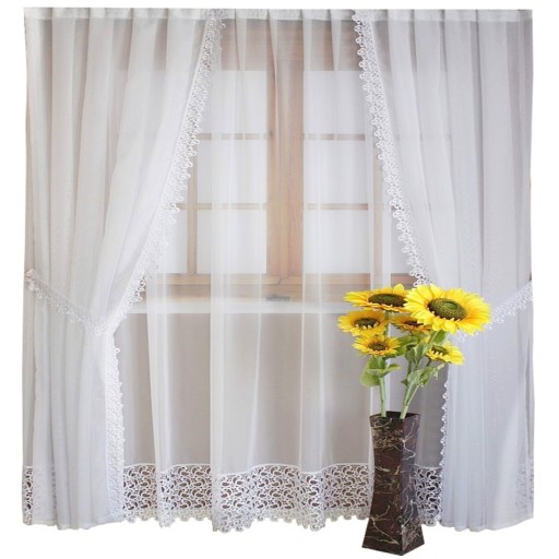 Firana woalowa z gipiurą ~30 cm. Zasłonki dekoracyjne z gipiurą ~8 cm. Firana wykonana jest na prosto z gipiurą na dole. Zasłonki mają wszytą gipiurę po boku. Firana i zasłony dekoracyjne wykonane są oddzielnie na taśmach 6 cm typu smok. Do wyboru 3 wzory gipiur. Komplet firan nadaje się na karnisze od ~230 cm do ~300 cm szer. Inne rozmiary i fasony firan na naszych pozostałych aukcjach.
