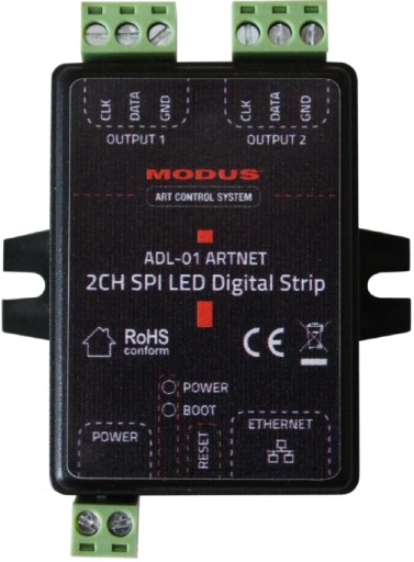 MODUS ADL-01 ARTNET 2CH SPI LED Digital Strip jest sterownikiem cyfrowych diod LED z obsługa protokołu ArtNet. Zasilany jest z bezpiecznego napięcia z zakresu 12-24VDC. Posiada zewnętrzne wejście zasilania lub może być zasilany poprzez Passive POE. Idealnie nadaje się do sterowania cyfrowych pasków LED oraz cyfrowych modułów LED w stałej instalacji. Urządzenie posiada 2 niezależne wyjścia z możliwością podłączenia do 170 pikseli RGB na każdym z wyjść. Dzięki płaskiej metalowej obudowie z adapterem na szynę DIN 35mm możemy zamontować sterownik w pobliżu sterowanych LEDów lub w standardowej szafie rozdzielczej. Zastosowany system standardowych złącz RJ45 dla Ethernet oraz rozłącznych złącz śrubowych dla wejścia zasilania i wyjścia na LEDy ułatwia montaż oraz późniejszą eksploatację. W urządzeniu zastosowano zabezpieczenie przed odwrotną polaryzacją napięcia zasilającego oraz przeciw przeciążeniowe. Chronią one nie tylko konwerter ale również sterowane LEDy przed uszkodzeniami. Konwerter pracuje w sieci LAN i jest sterowany popularnym protokołem ArtNet. Współpracuje z dedykowanym oprogramowaniem MODUS DevManager, dzięki czemu cała konfiguracja odbywa się zdalnie przez sieć Ethernet. Jest to idealne rozwiązanie w przypadku zamontowania urządzenia w trudno dostępnych miejscach. Moduł posiada wyjścia sygnału Data i CLK, współpracuje z cyfrowymi LEDami zasilanymi z napięcia 5V, 12V oraz 24V. Obsługuje 6 typów cyfrowych diod LED: APA101, APA104, TM1803, TM1804, TM1809, TM1812