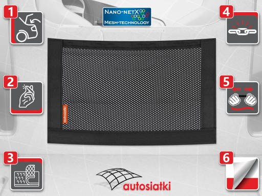 To wytrzymała siatka Nano-NetX obszyta od dołu i po bokach taśmą typu rzep. Od góry wykończona gumą, która chroni akcesoria przed przemieszczaniem. Zastosowany materiał Mesh-Technology zabezpiecza przed wypadnięciem nawet niewielkie przedmioty. Kieszeń mocuje się do wykładziny w bagażniku lub kabinie auta.