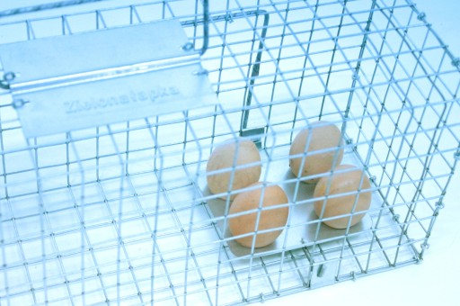 W naszej pułapce opisaną powyżej tacę zanętową (czterootwworową) można wykorzystać do stworzenia tzw."gniazda jaj" - należy dołożyć kilka jaj (zdj. obok). Widok gniazda wypełnionego dużą ilości jaj sprawia, iż zwierzaki próbują je wyciągnąć. Zwierzęta zazwyczaj się na to nabierają. Kiedy wyciągną chociażby jedno z jaj, poruszają tacę, a ta z kolei uruchamia mechanizm zamykający pułapkę
