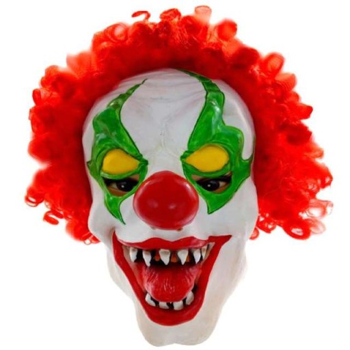 Maska strasznego Klauna raczej nie służy do rozbawiania dzieci. Wręcz przeciwnie - do straszenia. Klaun wygląda jak z horroru. Ma czerwone włosy i delikatnie mówiąc jest brzydki. .Maska wykonana z gumy. Otwory na oczy znajdują się obok oczu kluna. Posiada otwory nosowe i gębowe - zatem można mówić i oddychać :) Sztywne włosy same stoją na baczność.