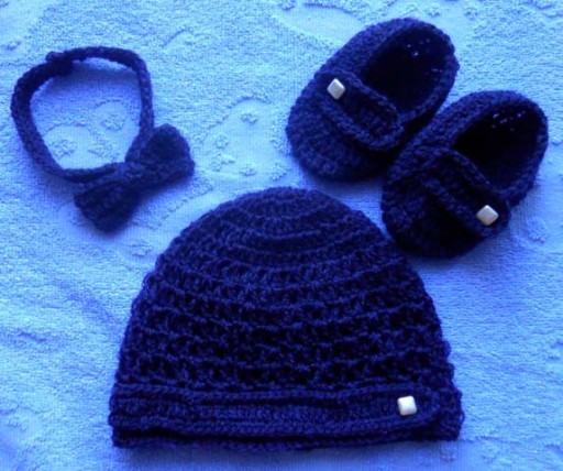 Komplet szydełkowy 3-cz.: czapeczka+buciki+muszka może być wykonany w dowolnym kolorze włóczki i dodatków.