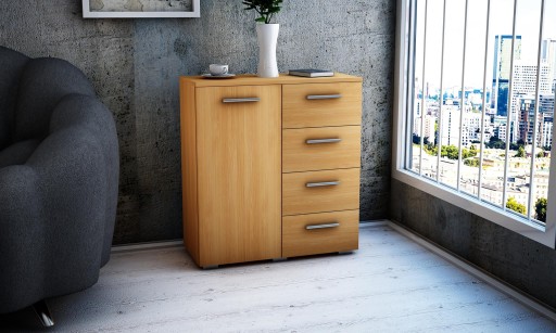 Komoda HELENA 80cm 1D4S wykonana jest z bardzo dobrej jakości płyty laminowanej o grubości 16mm, którą cechuje zwiększona odporność na zarysowania oraz odporność na ścieranie i wilgoć (możliwość ścierania wilgotną gąbką).