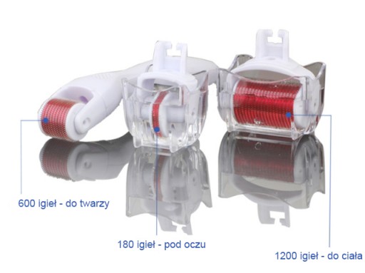 Składa się z trzech różnych głowic, oraz rączki, na którą nakładamy odpowiednią głowicę: 1200 igieł do ciała (1,5mm), 600 igieł (0,5mm), 180 igieł do okolic oczu (0,5mm).