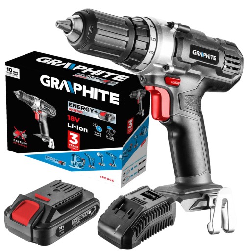 - Dwubiegowa wiertarko-wkrętarka GRAPHITE, współpracująca z akumulatorami 18V Li-Ion GRAPHITE Energy+.
