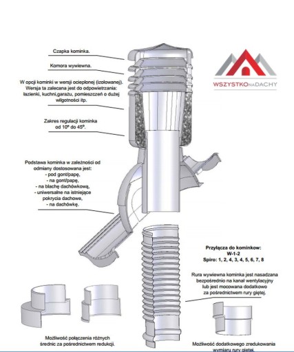 Kompletny kominek wentylacyjny z profilowanym przejściem dachowym, montowany bezpośrednio na blachodachówce. Wersja izolowana, która zapobiega kondensacji pary wodnej w przewodzie wentylacyjnym, najczęściej zauważalnej w okresie zimowym.