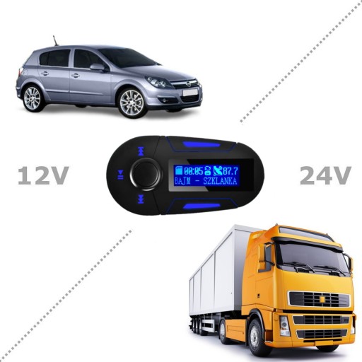 Transmiter może być zasilany napięciem 12V lub 24V dzięki czemu nadaje się on zarówno do samochodów osobowych z napięciem 12V jak i ciężarowych z napięciem 24V.