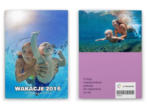Jeśli chcesz możesz umieścić jedno wielkie zdjęcie zajmujące przednią okładkę, tylną i grzbiet. Robisz to umieszczając odpowiednio szerokie zdjęcie na przedniej okładce. Jak widać na zdjęciu, na tylnej okładce jest też umieszczony kod kreskowy i logo ouhmanii. Kod jest nam potrzebny aby szybko i bezbłędnie wysłać każdą książkę pod wskazany adres.