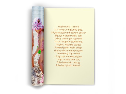 Jeśli mamy do opowiedzenia bardzo dużo, możemy na stronie nie umieszczać zdjęć a jedynie sam tekst. Przykładowo na lewych stronach opowiadamy naszą historię a na prawych wstawiamy zdjęcia.