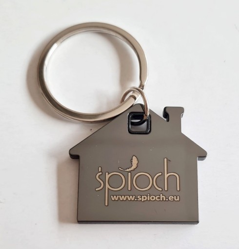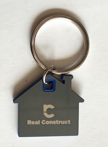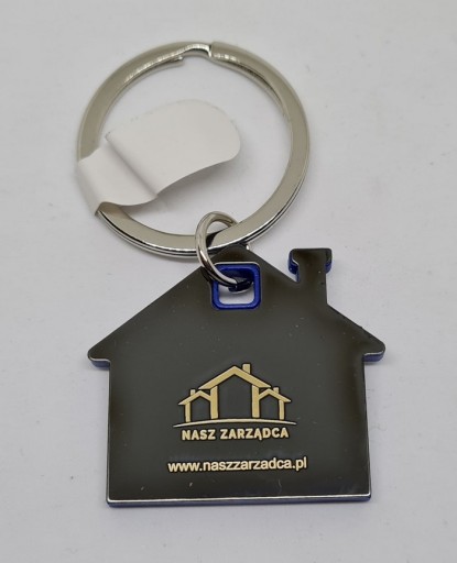 Brelok na klucze w kształcie domku, wykonany ze stali nierdzewnej oraz ABS.