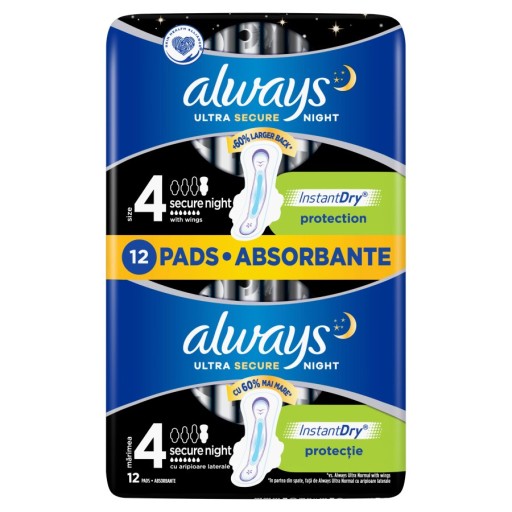 Bez kompromisów. Podpaski Always to najlepsze połączenie ochrony i komfortu Always. Wypróbuj Always Ultra Secure Night (rozmiar 4), najlepsze podpaski Always oferujące ochronę w nocy.